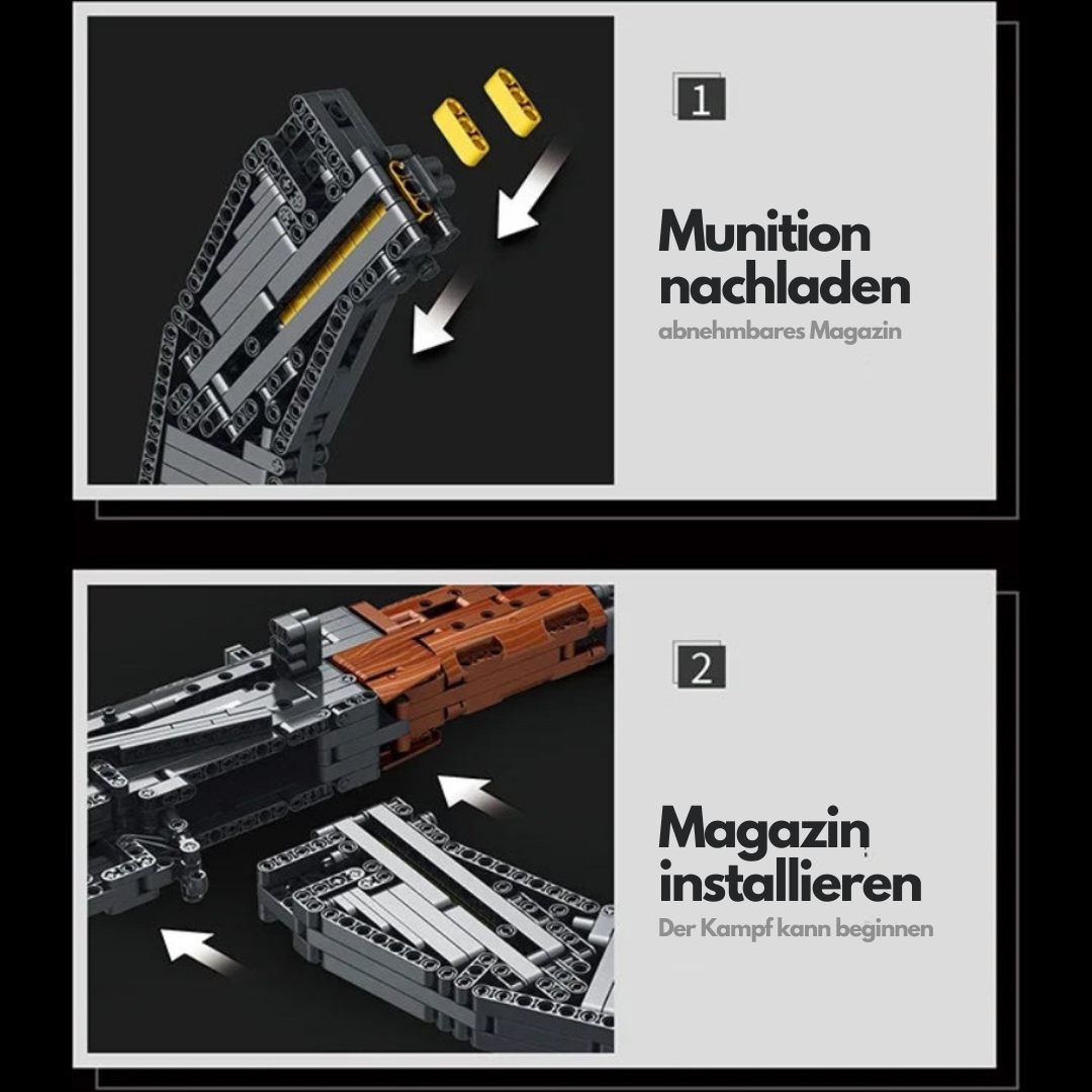 Unsere BrickBlaster AK-47 besitzt ein abnehmbares Magazin mit Munition, kann realistisch nachgeladen werden und schießt 5-10 Meter!