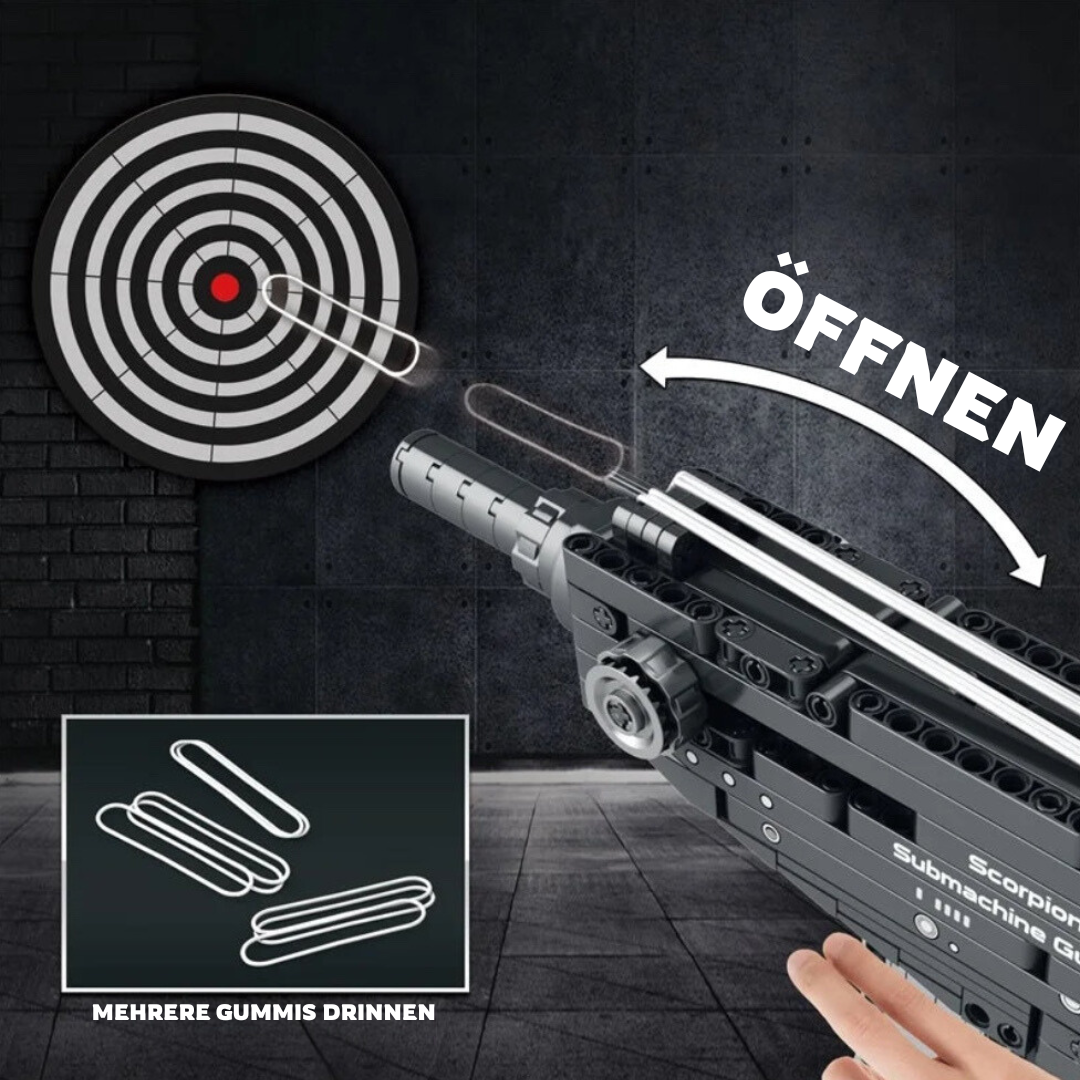 Unsere BrickBlaster Scorpion besitzt ein abnehmbares Magazin und wird mit Gummis geladen, welche 5-10 Meter geschossen werden!